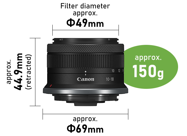 Lens construction: 12 elements in 10 groups Closest focusing distance: 0.14m (AF), 0.086m (MF, at 10mm) Maximum magnification: 0.23x (AF, at 18mm), 0.5x (MF, at 10mm) No. of aperture blades: 7 (circular blade) Filter diameter: φ49mm Size: φ69 x 44.9mm (retracted) Weight: approx. 150g