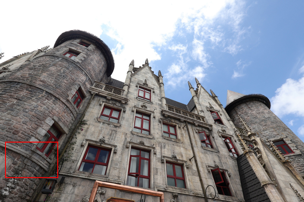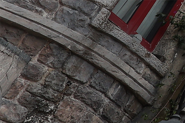 A close-up of the bottom-left edge of the image. The texture of the bricks and façade details are accurately reproduced in distinct detail even at the image edges.