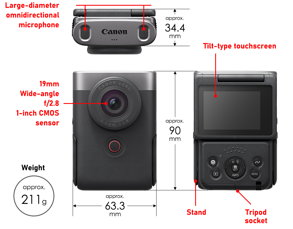 Size (approx.): 63.4 x 90.0 x 34.3mm Weight (approx.): 211g Image sensor: 1-inch type CMOS sensor Recording resolution: 13.1MP (video), 15.2MP (stills) Maximum recording size: 4K 30p Angle-of-view (35mm equivalent): 19mm (video), 18mm (stills) Maximum aperture: f/2.8 LCD screen: 2.0-inch tilt-type Ports and terminals: HDMI (Type D), external microphone input, Digital terminal (USB-C), tripod socket
