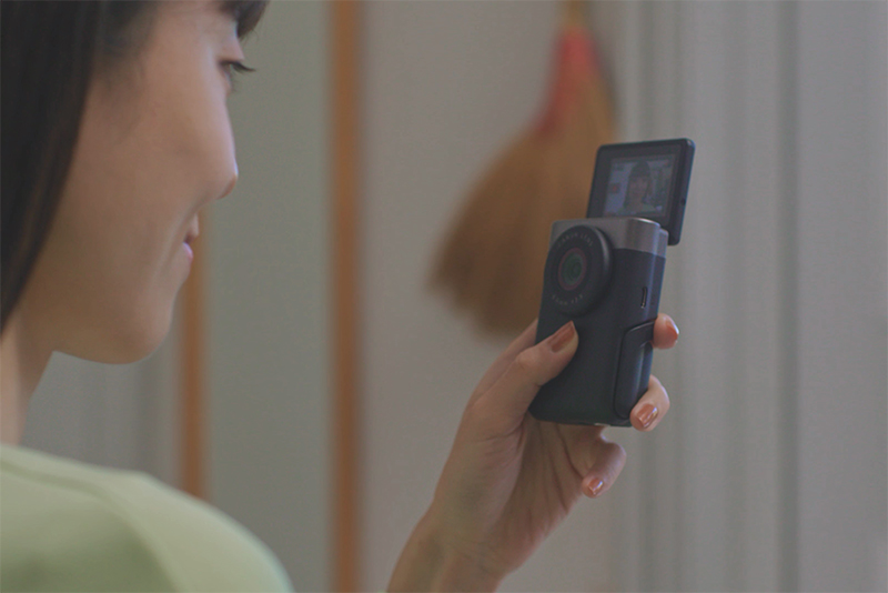 The camera is designed for stable, comfortable one-handed holding and operation during both vertical and horizontal shooting, regardless of whether you are right- or left-handed. The flip-up LCD monitor makes it easy to record yourself—or get creative with high or low shooting angles. Image stabilisation ensures steady footage even when shooting while walking.