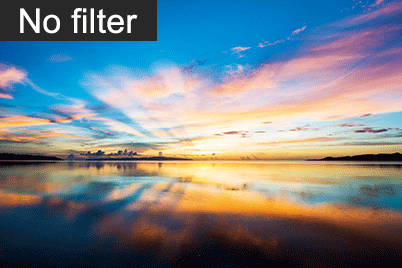 The 'No filter' example was exposed for the reflection of the sunset. The sky is too bright, and the colour contrasts appear weak. The brightest parts of the image are blown out.