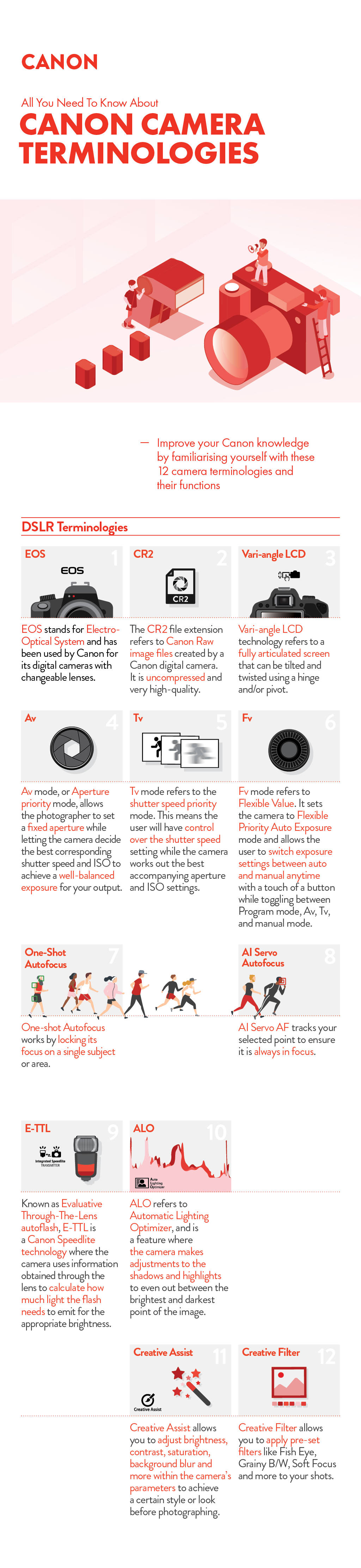 Don’t fret if you’re not an expert to these 12 terminologies and their functions in your Canon camera. We all start somewhere. Here’s a handy infographic on Canon camera terminologies to help you out!