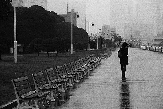 By using the [Grainy B/W] Creative filter, I was able to bring out the shadow on a wet pavement, while stressing the rain using the grainy sky as intended.