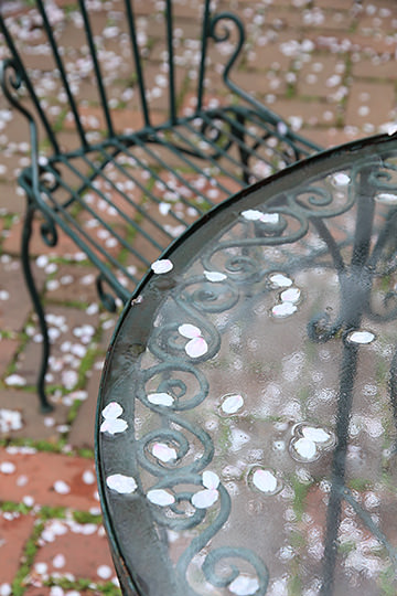 The rain blew the petals of the flowers all over the table, conveying the atmosphere of the season with a stylish touch. Here, the point is to find a shooting position that takes the angle of the chair into consideration.
