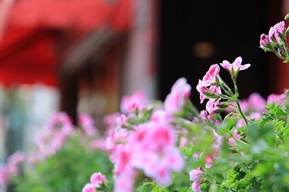 A close-up shot of flowers grown in the planters outside a restaurant. The charming bokeh adds a soft and soothing touch to the entire picture.