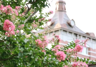 A telephoto lens is a lens with a narrow angle of view that captures a portion of the scenery. After deciding on your main subject, the way you include the building in the background will differ greatly depending on where you are standing and the angle at which your camera is positioned. For example, making the flowers in front of the building the main subject while incorporating a distinctive part of the building in the background enhances the building’s appeal.