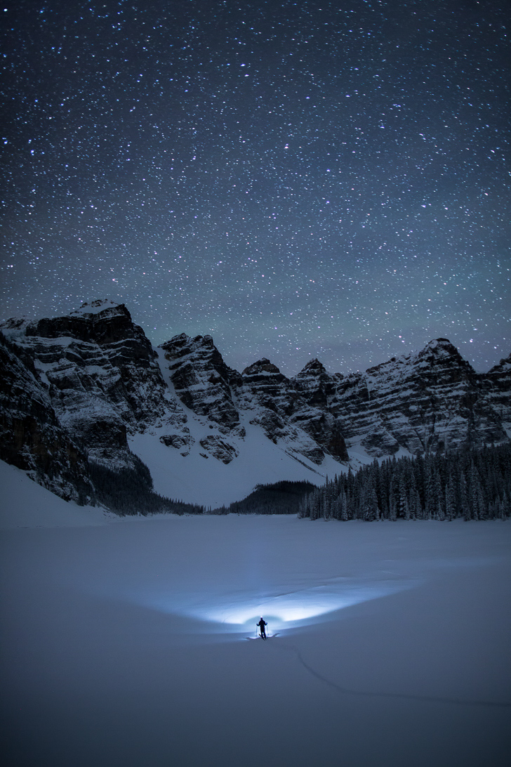 A solo Winter trip to Moraine Lake rewarded me with a snow-filled and pristine vista, no light pollution, no generator noise, and no other human for at least another 10km.