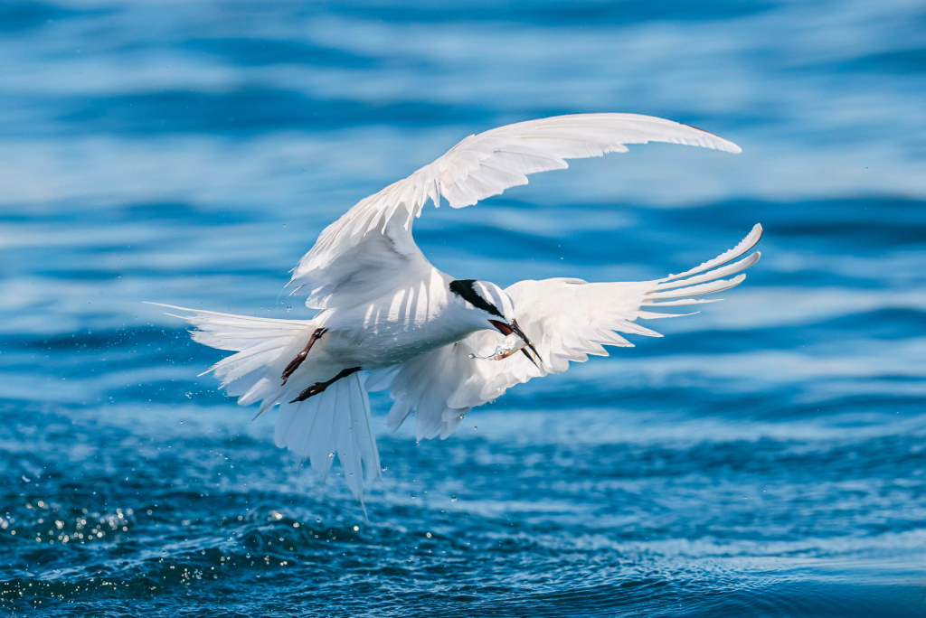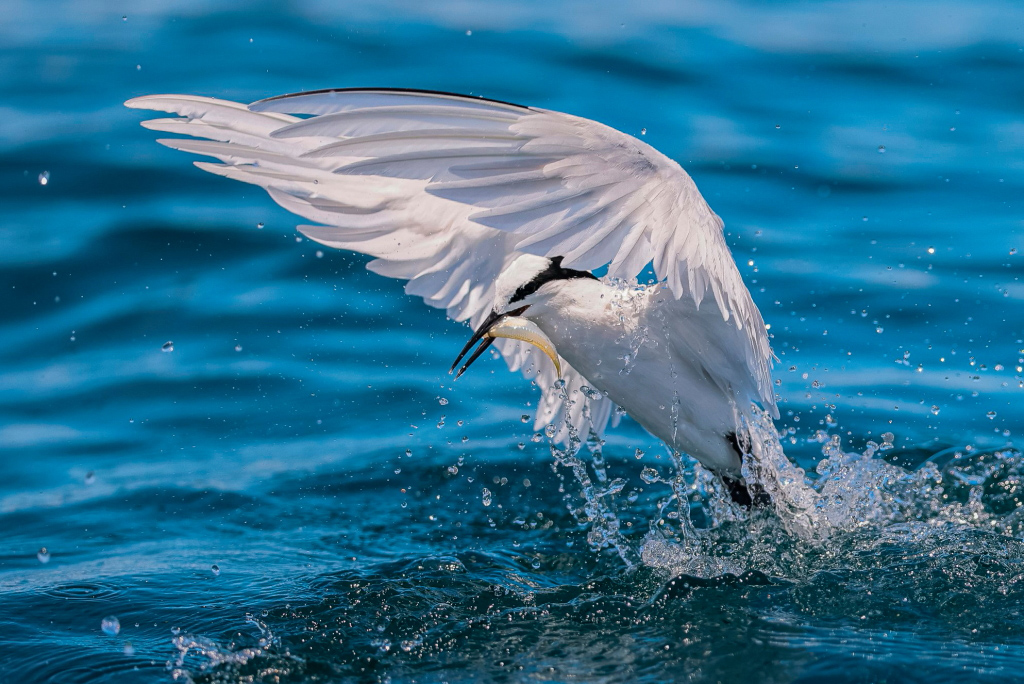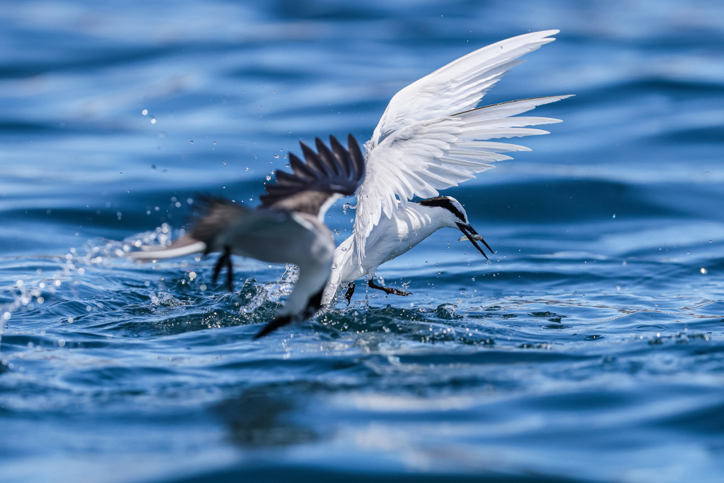 Terns usually fish in flocks, and when hunting for food, their flight path is quite unpredictable, so there is a high chance of other birds flying in the way even when you want a solo shot of just one bird.