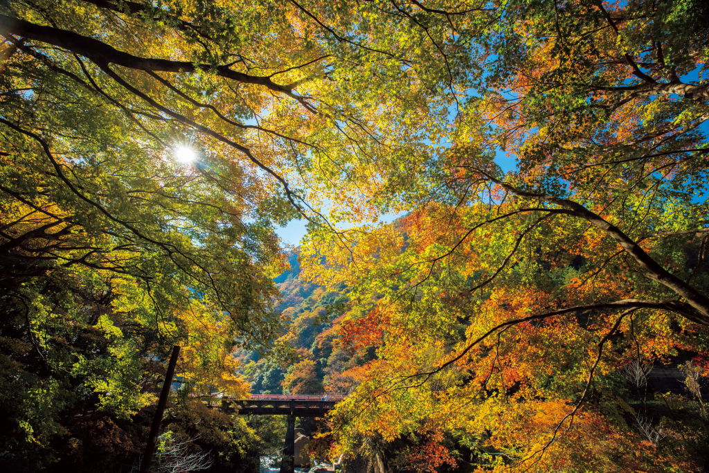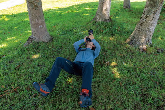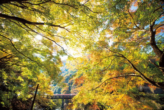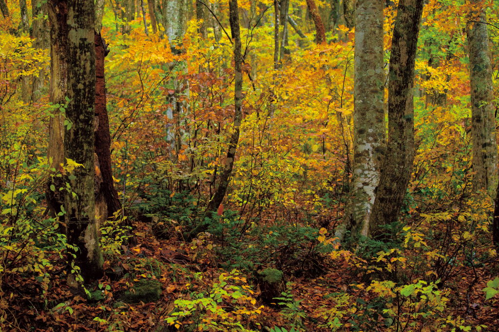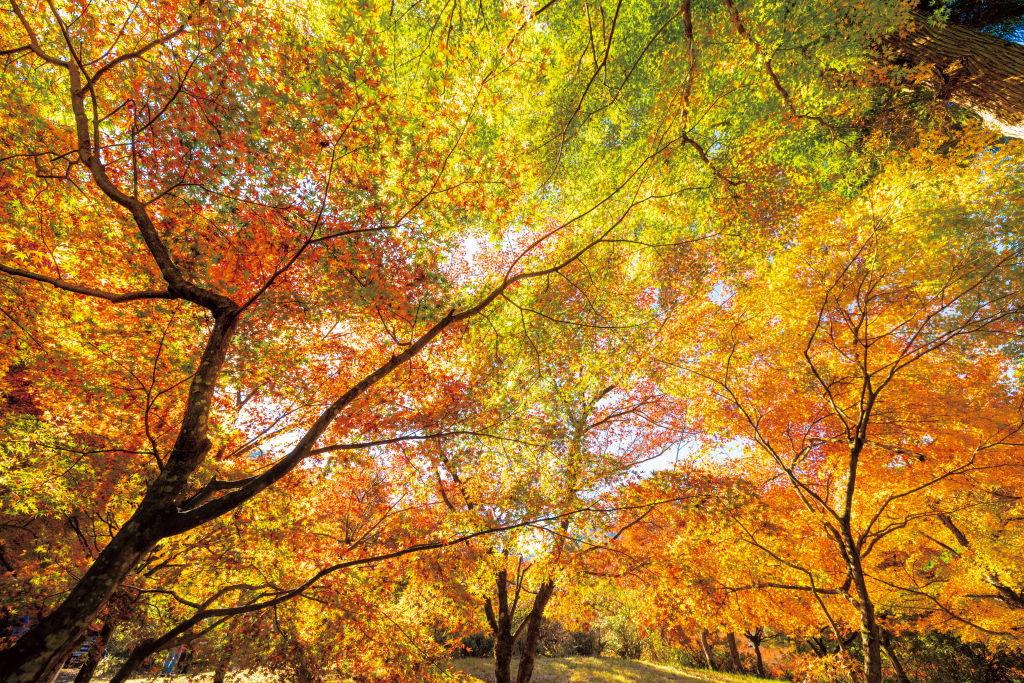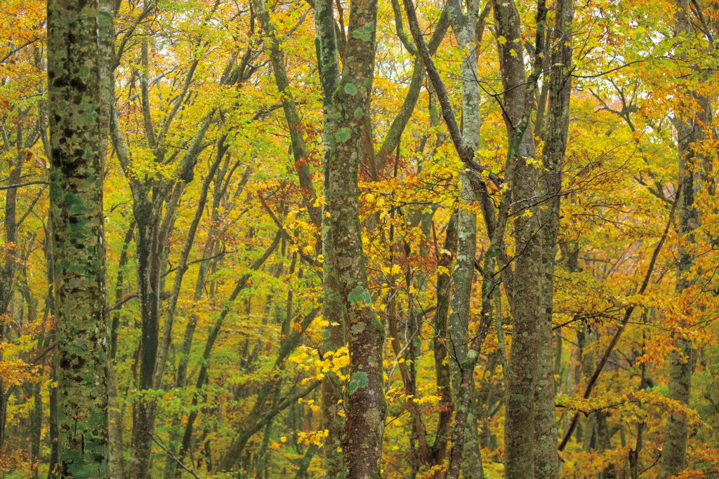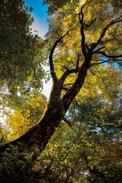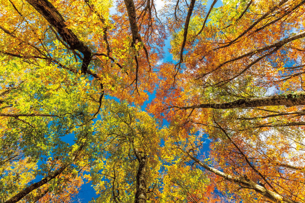 Some trees have a unique shape that you want to bring out in your photo, like the Japanese beech tree in the photo above with its characteristic tall and straight trunk. To give the tree trunk sufficient visual weight while complementing it with the vibrant autumn leaves, I used an ultra-wide-angle lens (in this case, the RF15-35mm f/2.8L IS USM) and took a low-angle shot from close to the base of the tree, applying diagonal composition.