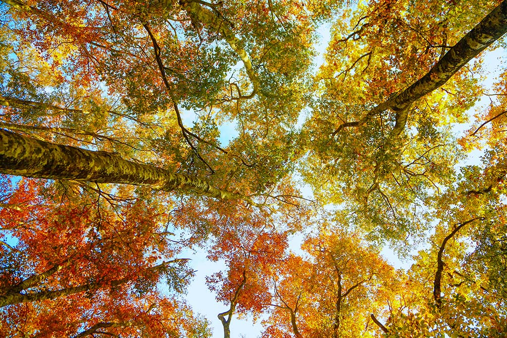 Have you ever looked through a kaleidoscope? That’s exactly what tall trees clustered together look like when photographed from directly below, especially with their colourful leaves in autumn.
