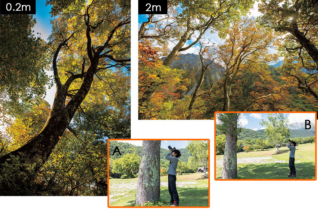 A: Shot as close to the tree as possible at the lens’ closest focusing distance, looking upward. B: Shot from 2m away. The tree doesn’t look as grand, and its branches don’t seem to spread as far.