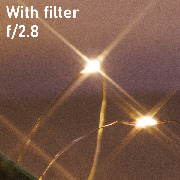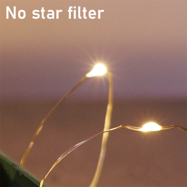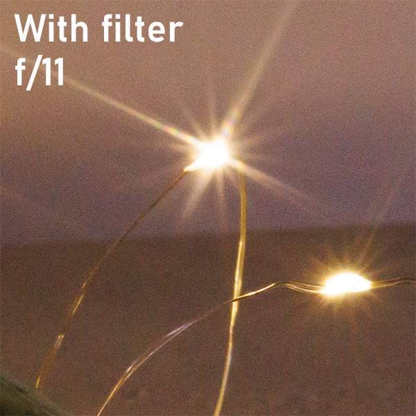 In the image shot without a star filter, there are starbursts at f/2.8, but very faint. Using a star filter crates starbursts with long rays. At f/11, some of the starburst rays are very short. Shoot at f/2.8 to f/4 for the best results.