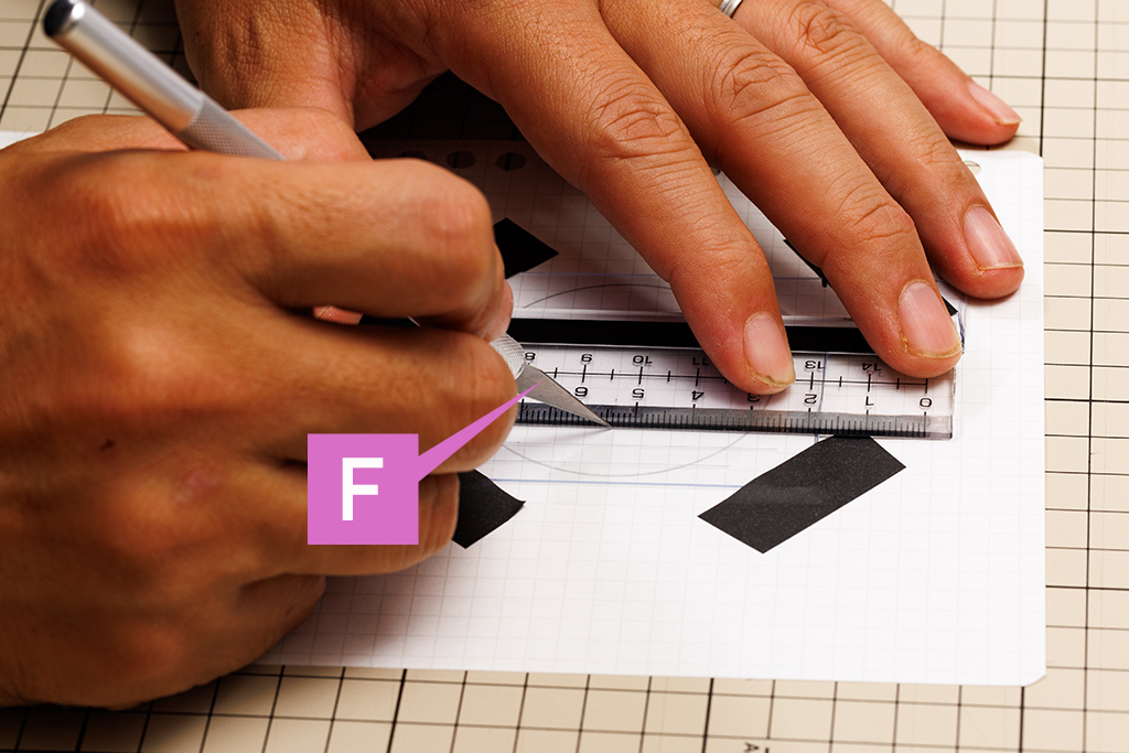 ii) Then, using the grids of the graph paper as a guide, use the cutter or craft knife (F) to gently cut horizontal and vertical lines onto the graph paper so that they form a criss-cross pattern. Use a ruler to keep the lines straight.