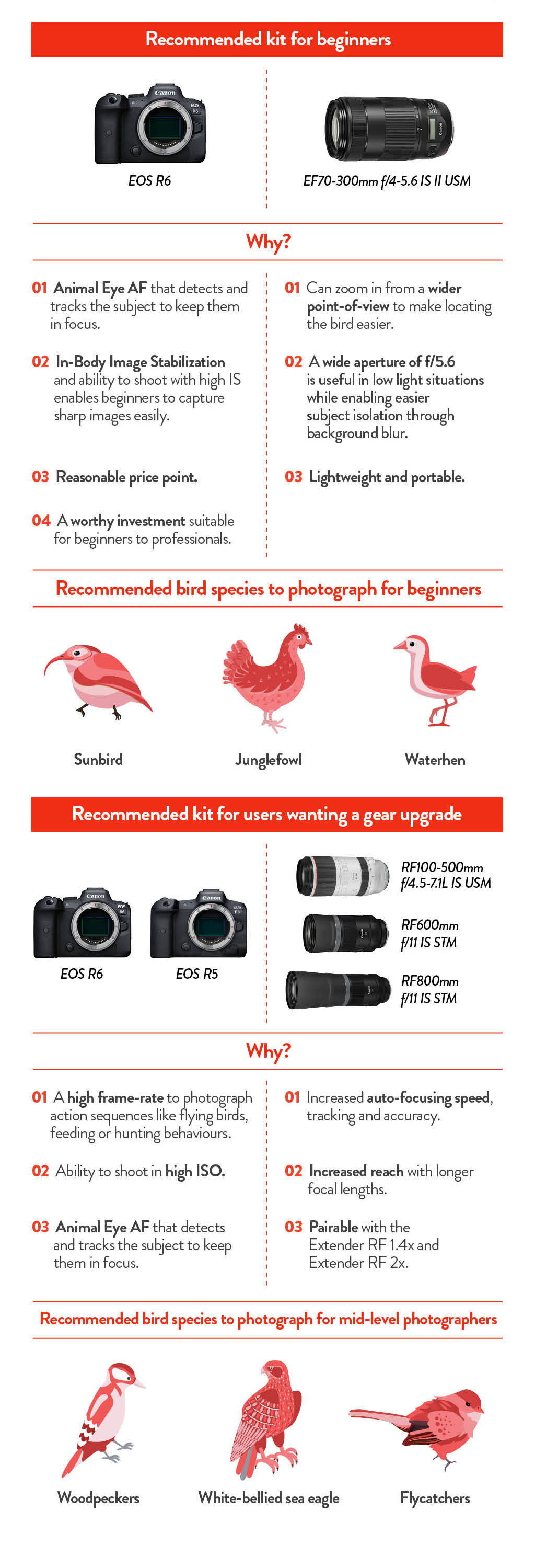 For the mid-level photographers shooting with the EOS R5/R6 and Canon RF100-500mm f/4.5-7.1L IS USM lens, Canon RF600mm f/11 IS STM or Canon RF800mm f/11 IS STM lenses, they can try photographing shorebirds. If you reside in Singapore, the recommended place for shorebirds is Sungei Buloh Wetland Reserve (SBWR), and Dairy Farm Nature Park or Windsor Nature Park for forest birds.