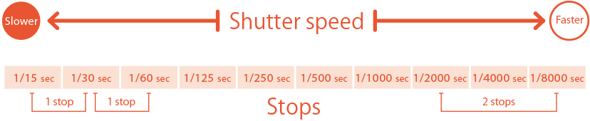 When we increase the shutter speed from 1/30 sec to 1/60 sec, for example, this halves the length of time when the shutter is open and we refer to it as “making the shutter speed 1 stop faster”. On the other hand, when we decrease the shutter speed from 1/60 sec to 1/30 sec, we double the length of time when the shutter is open and therefore “slow the shutter speed by 1 stop”.