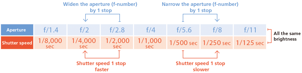 Take a look at the chart below. It shows clearly how there are a few patterns to the combination of aperture and shutter speed. You might find it difficult to decide on which combination to pick. However, a digital camera is equipped with some very convenient automatic exposure (AE) functions that simplifies the process.