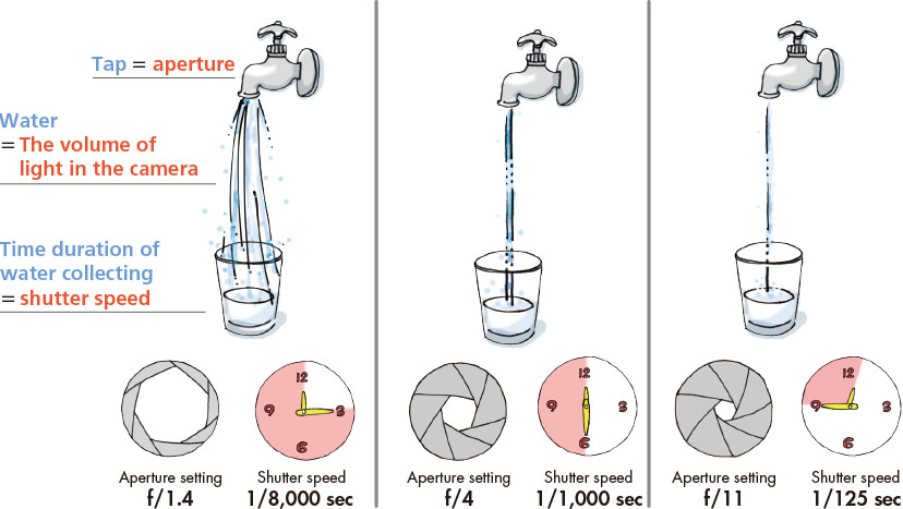 When tap (=aperture) is turned up, more water (=light) will flow in and the time taken for the water to collect (=shutter speed) shortens (=becomes faster) and is enough to get a good exposure. On the other hand, tap (=aperture) is turned down, less water (=light) flows in, the time taken for water to collect (=shutter speed) becomes longer.