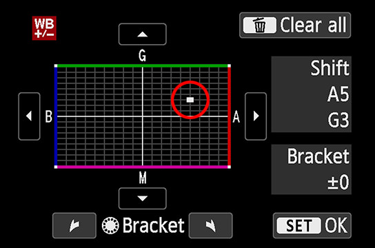 When using this feature, there are two axes you should keep in mind. The first is the B (Blue)/A (Amber) axis on which you can make simple adjustments to the colour temperature to make colours appear cooler or warmer. The second axis is the G (Green)/M (Magenta) axis, which lets you add unique colours to your photos that are difficult to obtain using the preset White Balance settings.