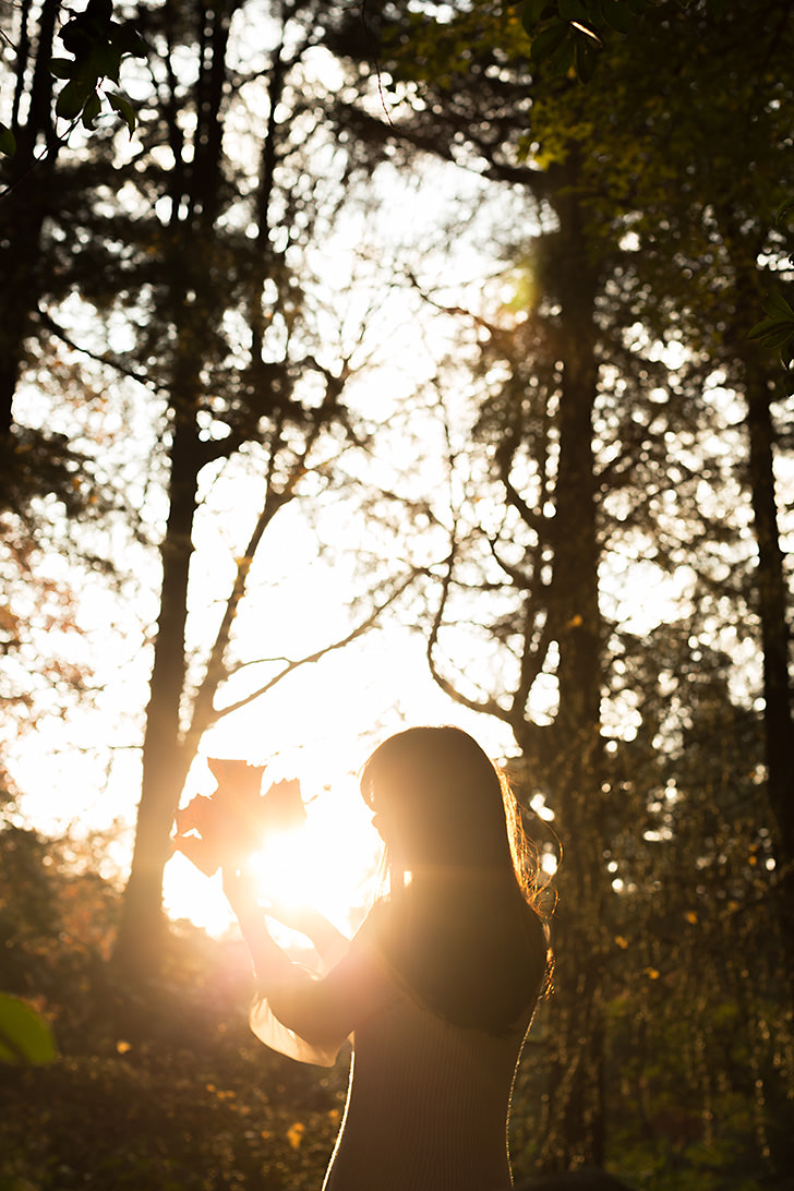 I took the shot at a location in the dark forest where the orange setting sun was shining through between the trees. I chose a spot where the trees were not visible behind my subject, and shot from about 1.5m away. I got the model to hold a large fallen leaf in her hands, and composed the shot to have the setting sun positioned between the leaf and the model’s face.