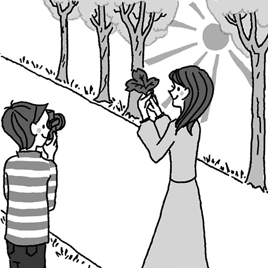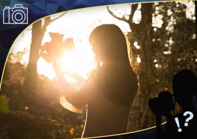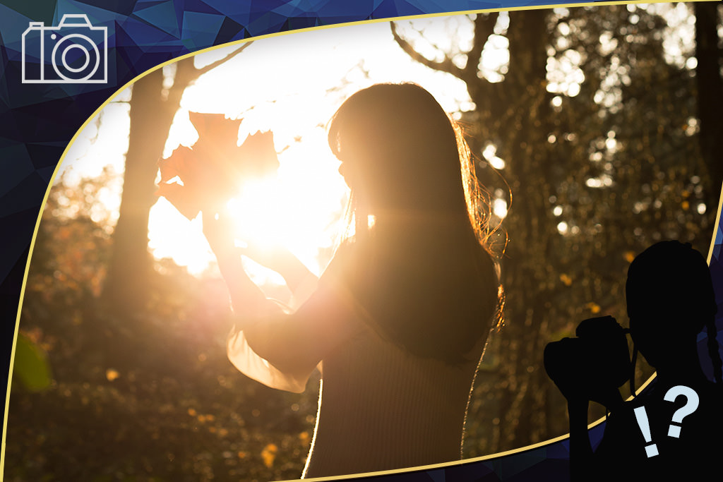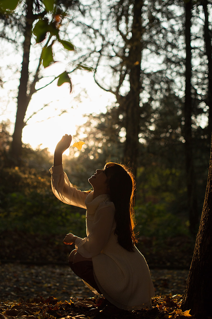 I chose a woman holding a fallen leaf as my main subject, and created a dramatic finish for the photo. I did so by removing the lens hood and shooting in the backlight of the evening sun to create flaring and ghosting.