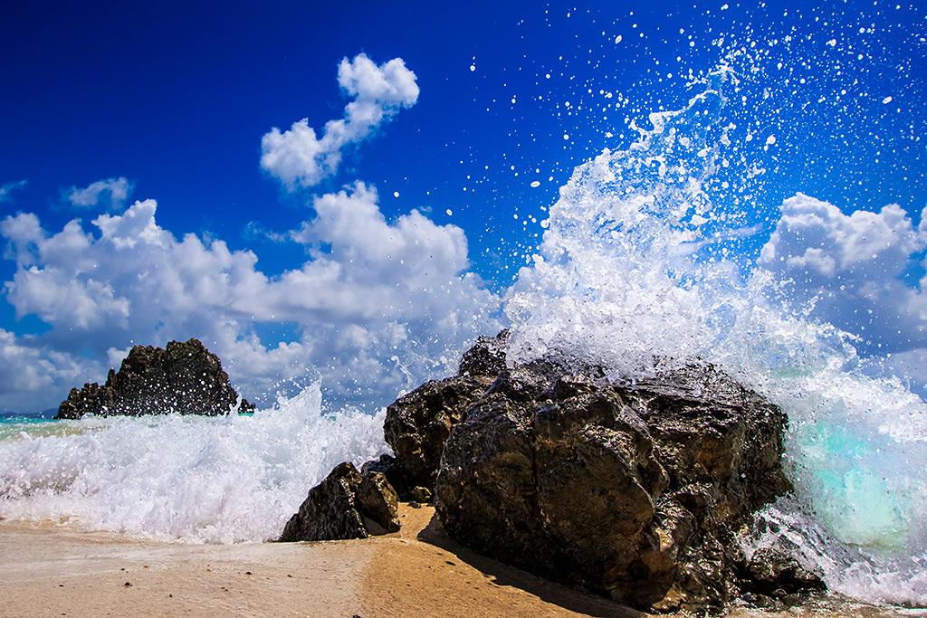 As a rule of thumb, a shutter speed of around 1/2000 second should be sufficient in most situations to freeze the spray of waves. However, in a situation such as this where I was shooting up close with a telephoto lens, fine blurring tends to occur at such speeds, so an even faster shutter speed worked better to perfectly capture the wave frozen in mid-air.