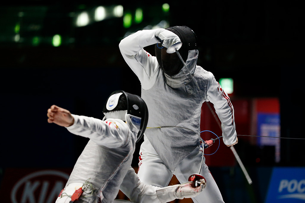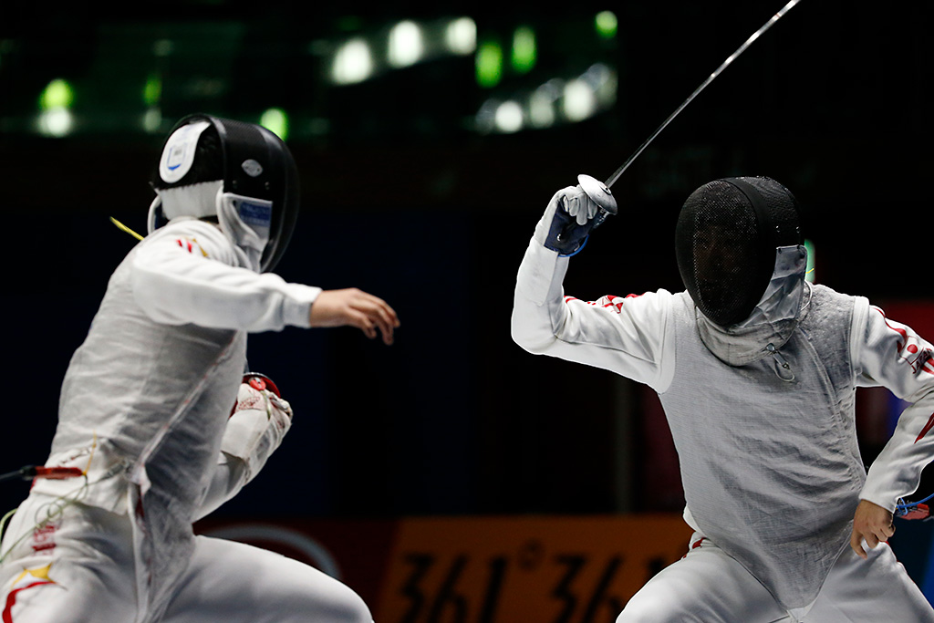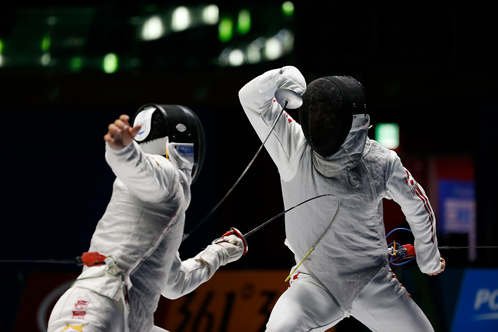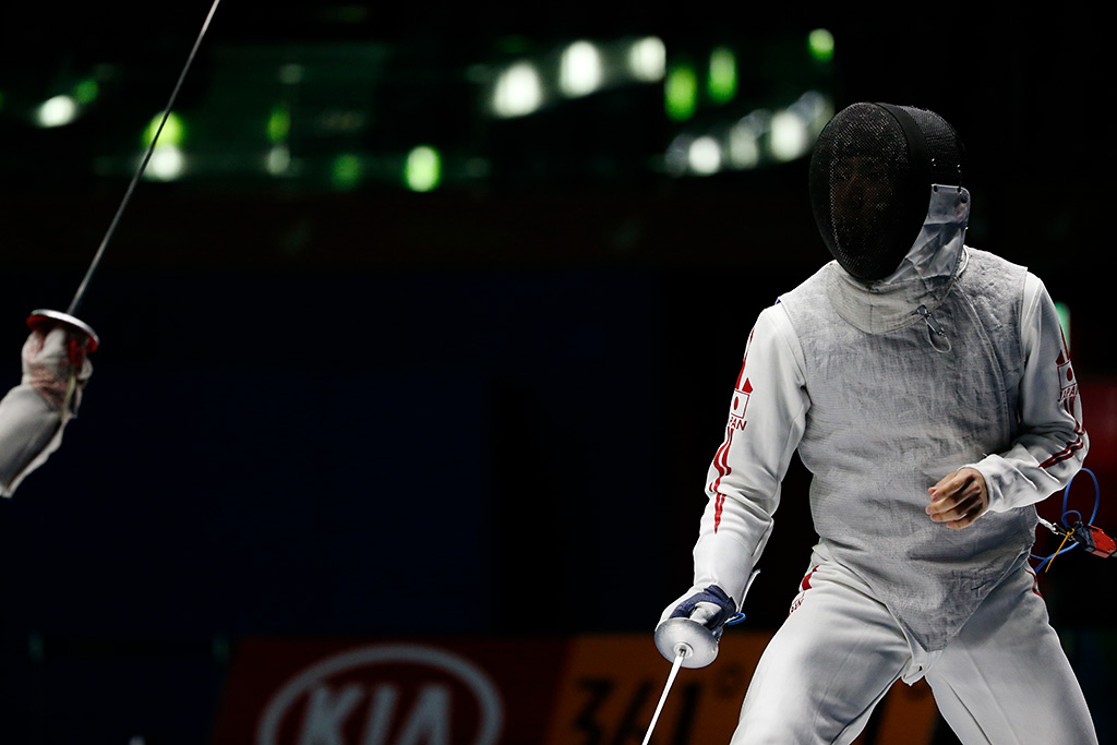 In fencing, actions are swift, which makes freezing moments a challenge. Using a fast shutter speed alone certainly isn't enough! This shot captures the instant when Yuki Ota on the right won a point from his opponent during the fencing qualifiers at the Asian Games. While photographing their bout, we used high-speed continuous shooting to capture the instant where the fencers thrust at each other.