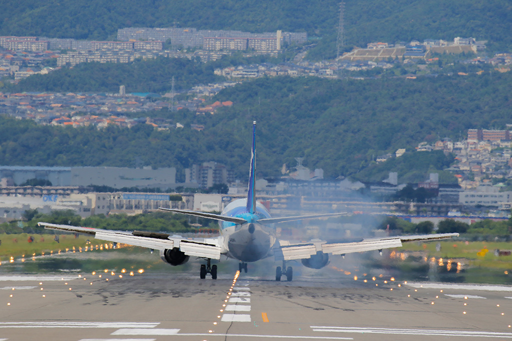 From the famous shooting location Senri River near Osaka International Airport, I started to shoot this passenger aircraft just as smoke began to stream from its tyres as it touched down onto the runway. The photograph above is the best shot of all the continuous shots taken, and seems to convey the screeching of the tyres and vibrations of the reverse thrust.