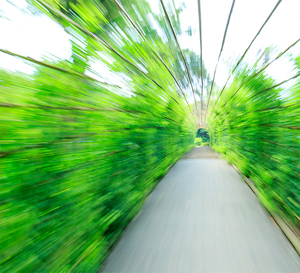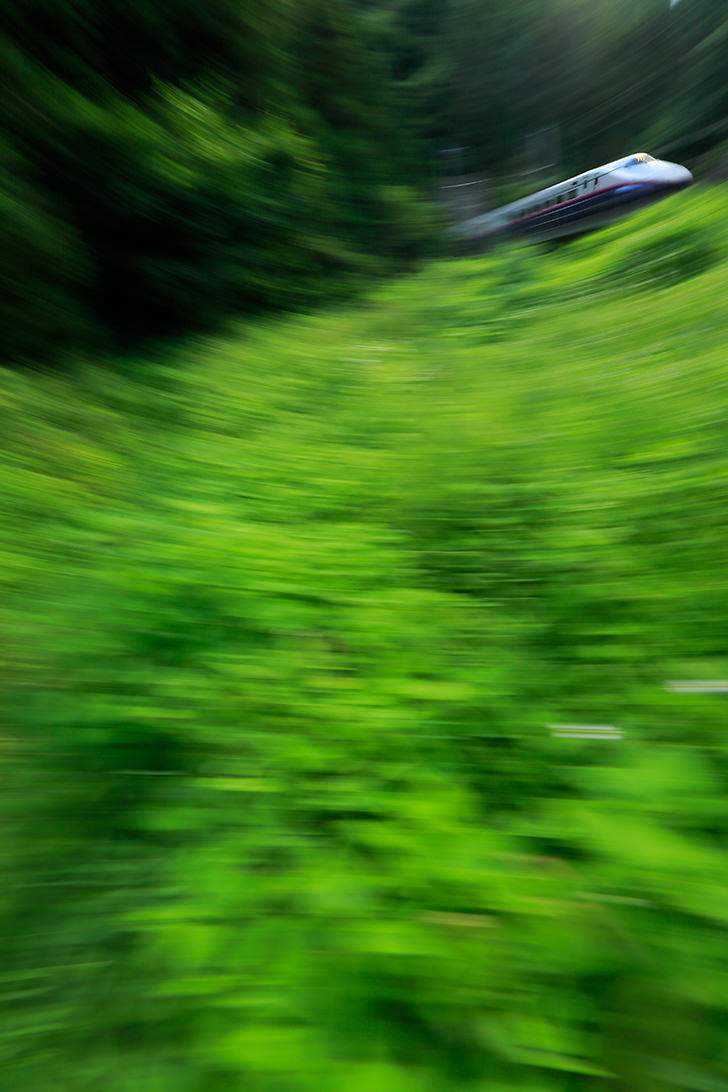 Besides the normal panning technique where you move the camera along a horizontal or diagonal axis, there is also the circular panning technique, which results in a radial blur effect. Combine these two and you get the technique I am about to introduce here, which I shall call the panning-spin technique. As you have to keep your lens aligned with a focal point on a moving subject even as you spin the camera, it is double the trickiness. For this photo, I framed the train in the top right of the photo, fixed the focal point of rotation on the right edge, and rotated the left side of the camera just like a pendulum. At the same time I moved my body in line with the moving train in a horizontal pan. In this way, I was able to express the dynamism of a moving train leap dashing out of the greenery in a way that would not have been possible with a normal panning shot.