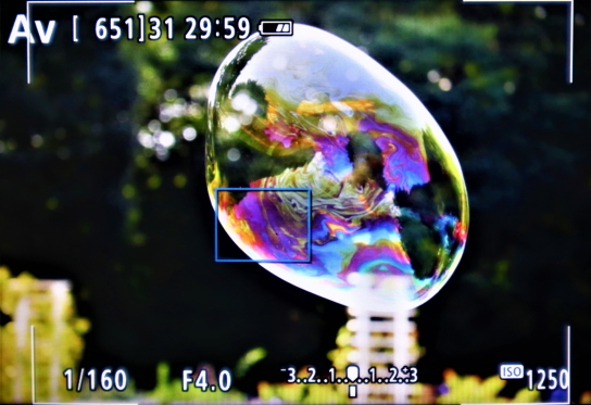 I used Servo AF to capture the image of a soap bubble that was constantly changing in shape as it was being carried by the wind. Despite the soap bubble’s translucency and unpredictable movement, the camera maintained focus on it. In Servo AF, when focus is established, the AF box turns light blue.