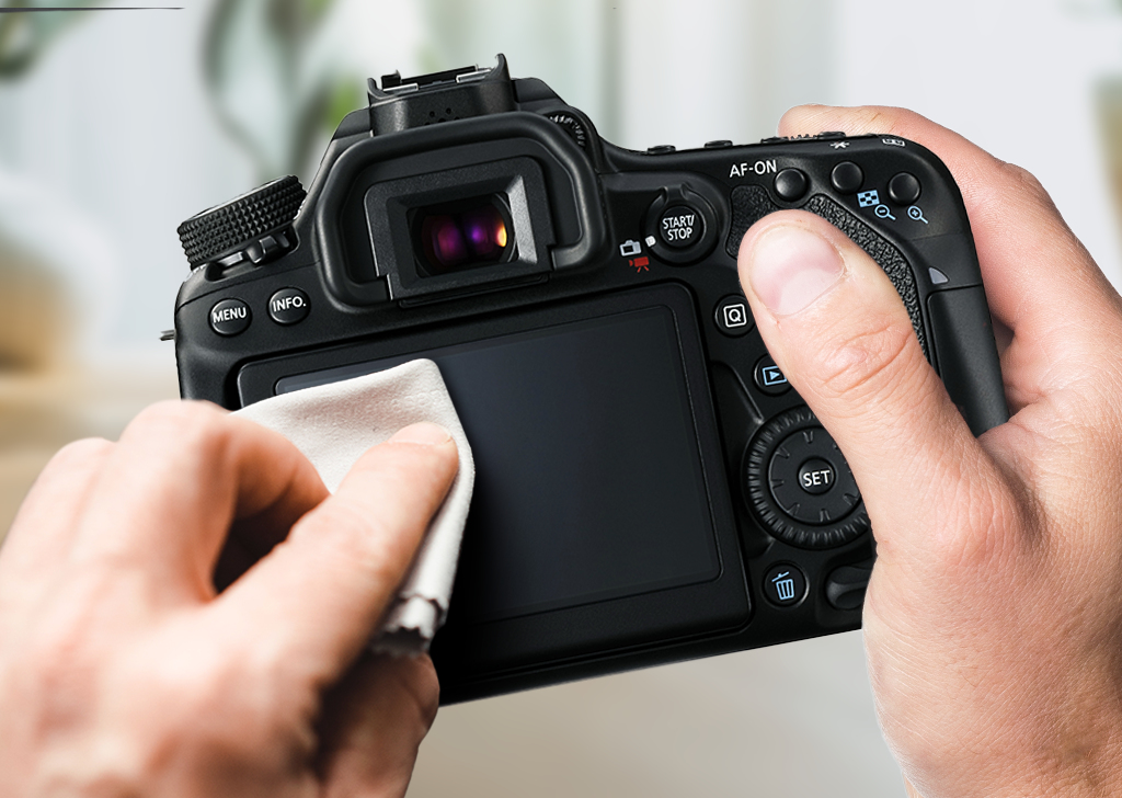 LCD screen: gently wipe down your LCD screen with a microfibre cleaning cloth or a soft dampened cloth. DO NOT use solvents or liquid-based cleaners as these might cause the LCD screen coating to peel off. In fact, do not use any solvents on any part of the camera as the solvent in question might seriously damage your camera body.