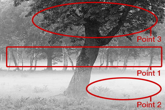 This scene was of a clearing on elevated ground that was shrouded in early-morning mist up to one metre above the ground. I was fascinated by it because it looked as though a soft focus filter had been applied only to the roots of the trees. This was what I wanted to bring out in my photograph.