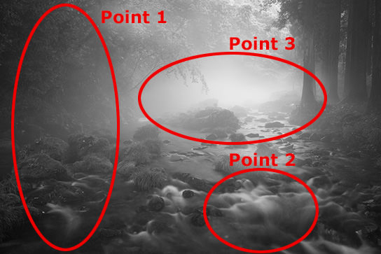When I shot this scene, the sky was overcast and mist was lingering upstream. The mist wafted above the water surface and did not form beyond that height. I chose a spot with less mist and set up my tripod from where I could see the flowing stream.