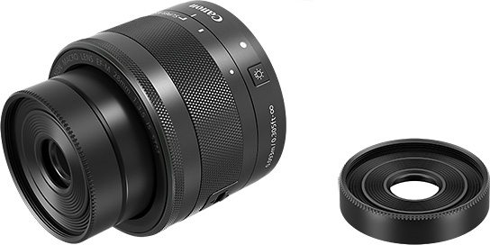 The first ever macro lens in the EF-M series, it has a 35mm equivalent focal length of 45mm. Two built-in LED Macro Lites are built into the front of the lens, on both sides near the lens glass, allowing an effect similar to that of a ring flash. A button located on the lens barrel allows you to turn either one or both of these lights on and off as well as select between two brightness options. The lens also comes with a Super Macro mode, which enables you to set the maximum magnification to 1.2x, more than life-size magnification in normal mode.