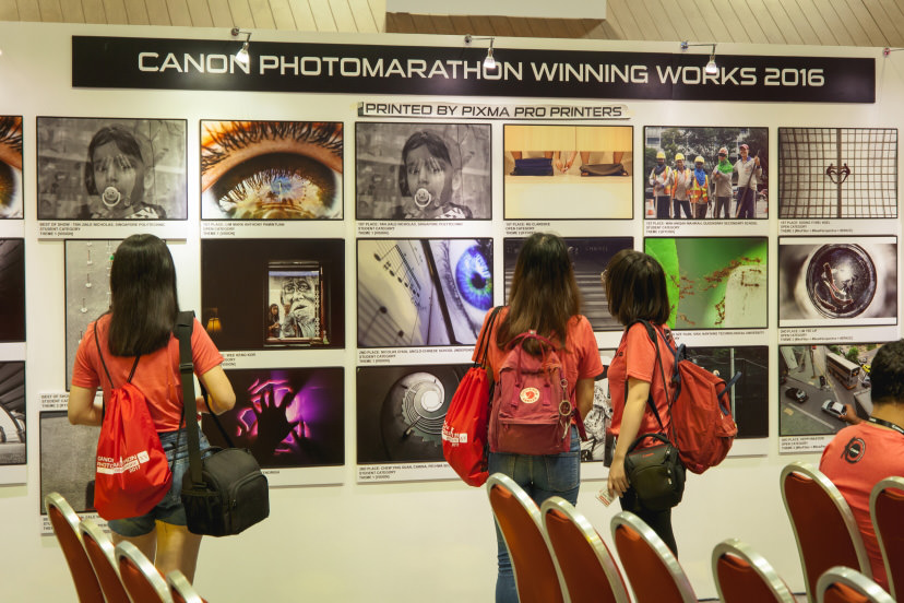 Participants seeking inspiration from the wall of works by last year’s Canon PhotoMarathon winners.