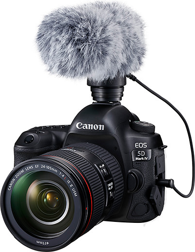 The EOS 5D Mark IV, which is seen above with the compatible Directional Microphone DM-E1, has a good reputation as a video recording machine. Its key movie shooting features are as follows: