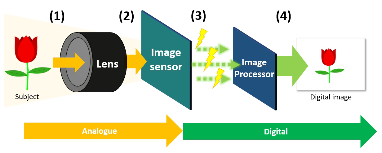 (1) Light from the scene enters the camera via the lens. (2) The light is gathered by the image sensor. (3) The image sensor encodes the information in the light into electrical signals. (4) These electrical signals are processed by the image processing engine to form the digital image. In Canon EOS cameras, this image processing engine is called DIGIC.