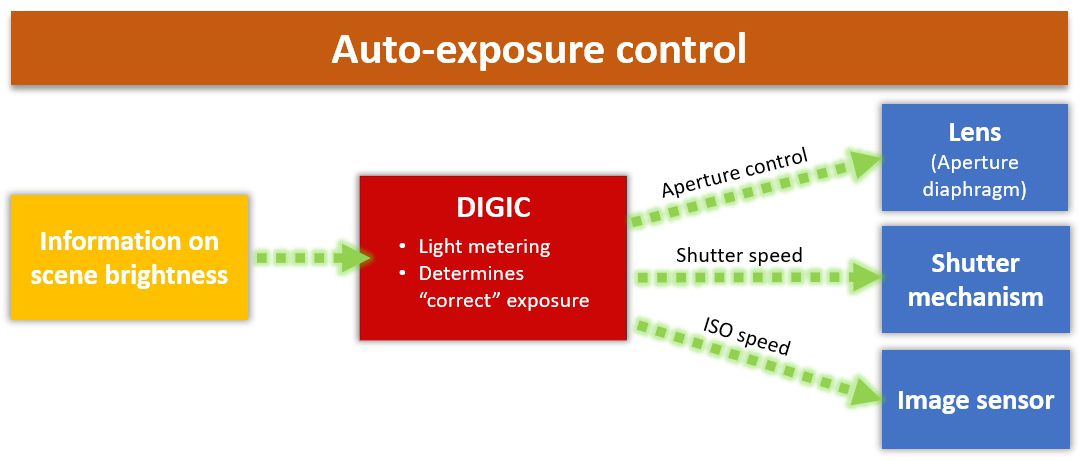 At shutter button half-press, the image processing engine starts metering the light. From there, it calculates the best exposure settings for the scene, and then communicates with the relevant parts to adjust the settings accordingly.