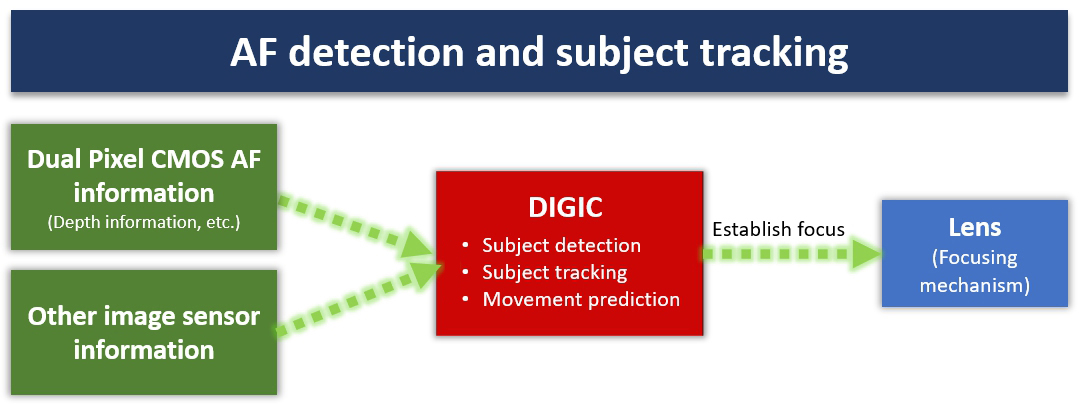 When you start the AF, DIGIC analyses the information from the image sensor to detect and track the subject. At the same time, it communicates with the lens to move the focusing mechanism inside the lens and establish focus.