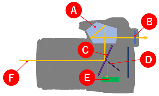 A: Pentaprism/pentamirror B: Optical viewfinder (OVF) screen C: Main mirror D: Secondary mirror E: AF sensor system F: Path of light