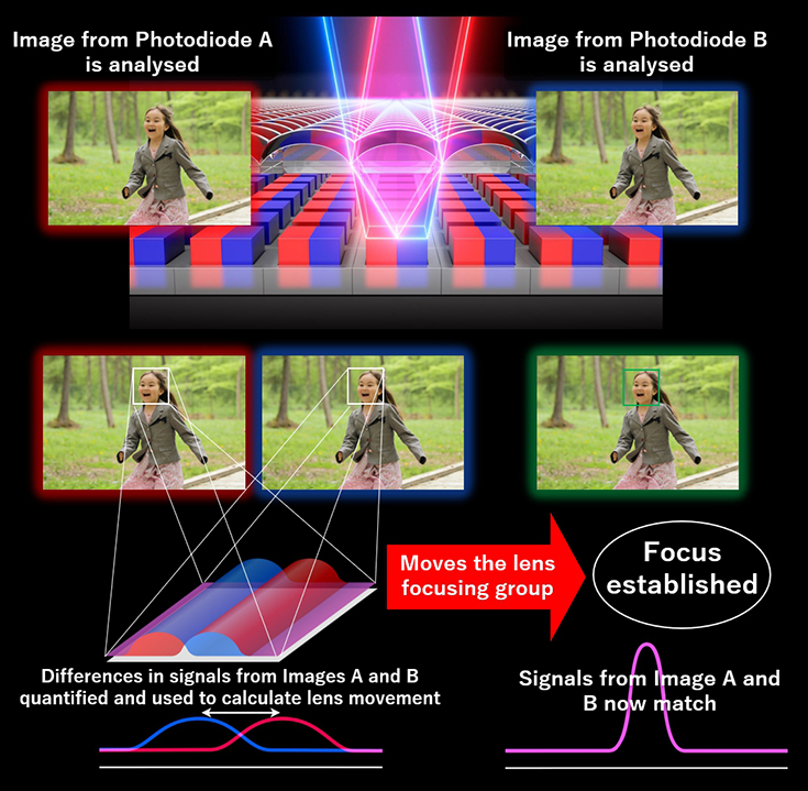As Photodiodes A and B are separated, they each produce an image that has a different point of view from the other (“parallax images”). The AF system analyses the differences (amount of blur), quantifies them, and uses them to compute how to move the lens so that the images match (= the subject is in focus).