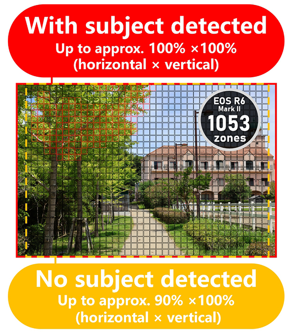 Dual Pixel CMOS AF also works in tandem with the EOS iTR AF subject detection and tracking system. When a subject is detected, AF is possible over up to 100% of the image area (might vary depending on the camera model).