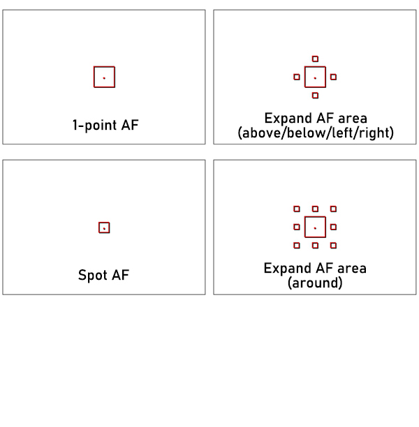 For example, - 1-point AF provides a small AF area that offers better precision over the subjects that you establish focus on, giving you greater control over your composition. - The Expand AF area modes improve tracking performance when photographing moving subjects, as the system also uses phase detection information from the areas surrounding the 1-point AF area. - Spot AF offers an AF area that is smaller than 1-point AF, ideal for scenes that require very precise focusing. - Whole area AF divides the entire image area into dense AF frame zones for AF. For example, the EOS R6 Mark II has 1053 zones that cover approximately 90%×100% (horizontal × vertical) of the image frame.