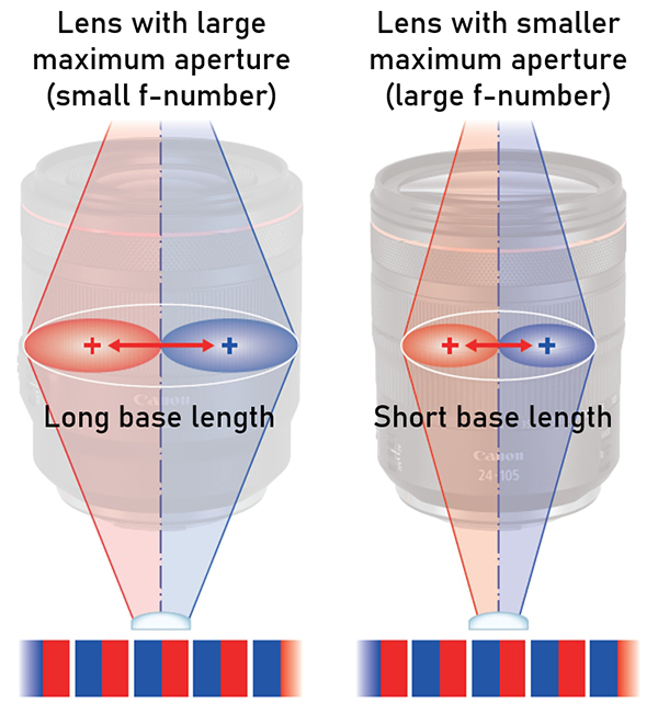 Lenses with a large maximum aperture (“fast lenses”) have a larger aperture diaphragm (lens opening), so the gap between the path travelled to the left and right photodiodes is even bigger. This results in a greater difference between the parallax images, which contributes to more precise AF calculations.