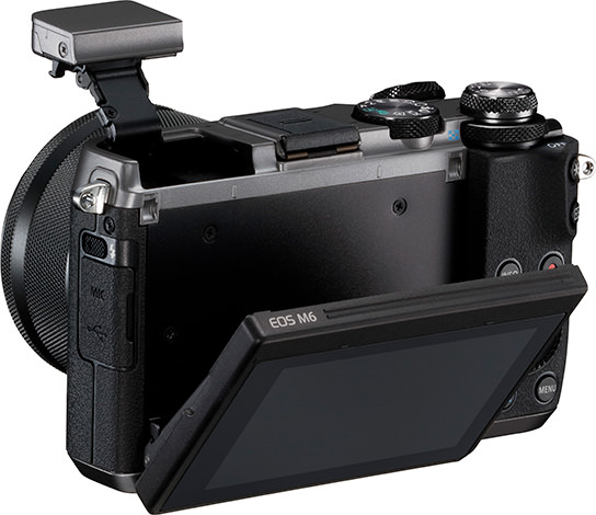 The EOS M6 is equipped with a tilting monitor and a built-in pop-up internal flash unit.