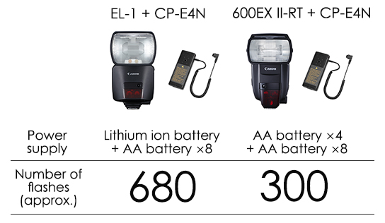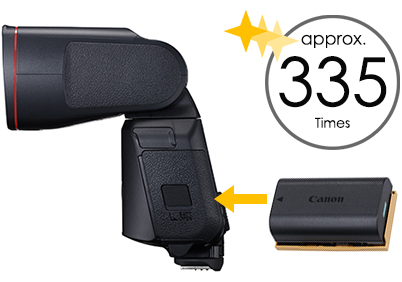 Speedlite EL-1 uses just one large capacity lithium ion battery—the LP-EL (1920mAh, 7.2 volts), capable of approximately 335 flashes on full charge, more than three times that possible on the Speedlite 600EX II-RT using four AA batteries.