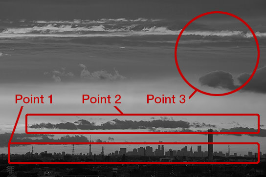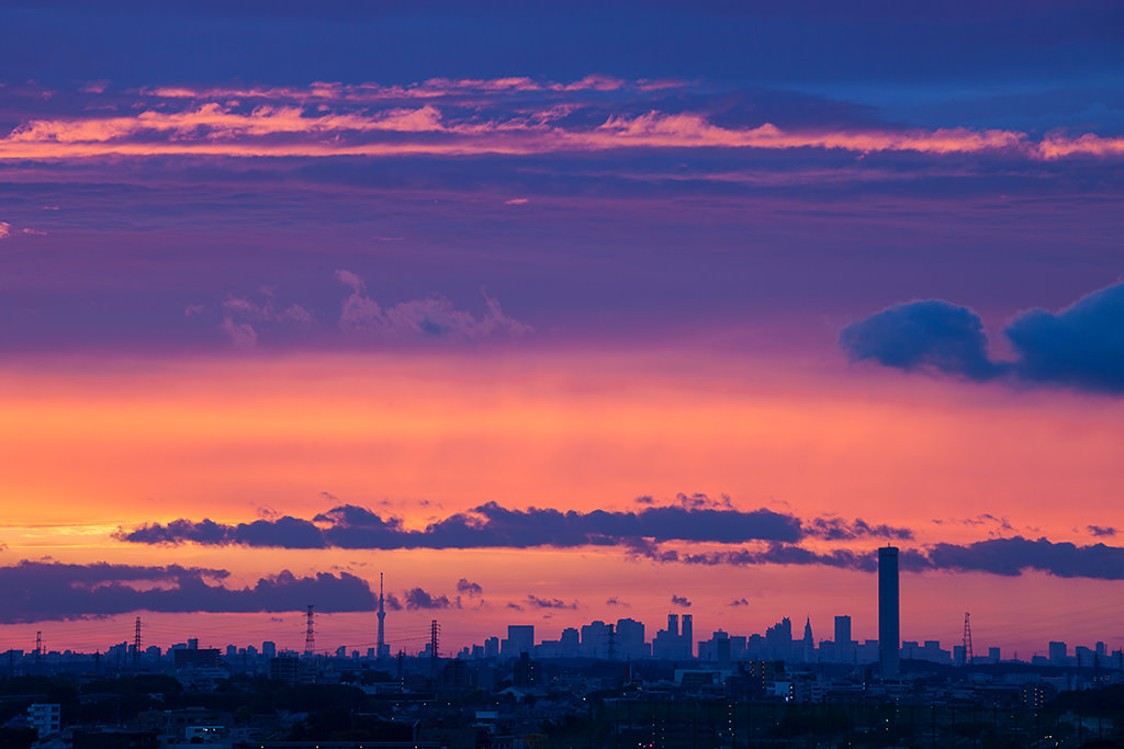 I wanted to be able to show the colour gradations in the tones of the sunrise, while at the same time, express the cityscape as a silhouette. In order to do that, I used a 176mm telephoto lens which gave a perspective compression effect that “drew in” the cityscape. Having the buildings appear as a small cluster brings out the dynamic appearance of the sky.