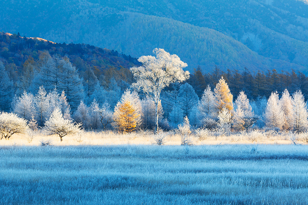To capture the larch trees that turned yellow at the Odashirogahara marshland, which is located about 200km north of Tokyo in the northern Tochigi Prefecture, I started my shoot before sunrise. There is a white birch, known as “the lady of Odashirogahara”, that stands alone on the wetland. I positioned the tree at the centre, while featuring the white plain covered in frost and the golden larch trees that formed a “folding screen” in the background to capture the wide expanse of the land. I then waited for the sun to shine on them from an angle to create a glittering look.