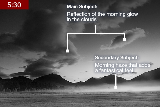 It is a race against time for shoots in the early morning. Conditions of the light are ever-changing, and thus no mistakes are allowed. In the following, I will explain three key points for capturing the decisive moment: time, composition and angle of view. (Reported by: Michiko Kaneko)