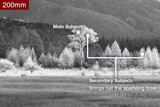 In Photo 1, I used a focal length of 47mm to capture a large number of elements. In contrast, with the focal length set to 200mm to capture a large view of the white birch, as illustrated above, I was able to bring out the sparkling frost that covered the trees. When determining the composition, you should take into consideration both the main and secondary subjects.