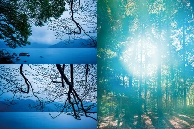 In landscape shots with lakes as the subject, the rising or setting sun is often included in the composition. However, one of the challenges lies in how we capture the sky. If there are nicely-shaped clouds that help to add expression to the sky, you can create a strong impact even if it occupies a large part of the composition. On the contrary, it would be difficult to evoke any kind of emotion simply with a blue or a grey overcast sky, or without the presence of vivid-coloured sunrise or sunset glows. To resolve this problem, find a place under the trees by the lakeside and cover the upper part of the image with the branches and leaves. Doing so helps to cover up a portion of the expressionless sky, resulting in a denser composition. However, you need to pay careful attention to the shape of the branches and leaves in this case, specifically, the shape of the branches must be beautiful, and there must not be any large white space between the luxuriant leaves. Additionally, make sure that the background is visible to a certain degree, otherwise the composition would look cramped and stuffy. The ideal choice of lens for such a composition would be a wide-angle zoom. You can tell intuitively that using an angle of view of16mm or 24mm helps to bring out volume in the branches and leaves covering the sky, while emphasising the scale of the landscape. Also, since the lake is the subject, it would look unnatural if the horizon is tilted, so care is needed to ensure that it is level.